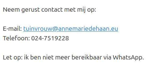 Ik spreek graag heldere afspraken af. Zo weet je precies waar je aan toe bent en blijft het voor ons allebei prettig en professioneel. We starten met een oriënterend bezoek op locatie van ongeveer 30 minuten. Tijdens dit bezoek bespreken we je wensen en stellen we samen het doel en de scope van het onderhoud vast. Dit eerste bezoek is kosteloos. Voor de uitvoering reken ik €40 per uur exclusief btw. Per afspraak geldt een minimale inzet van 3 uur. Een korte pauze voor een kop thee of koffie valt binnen mijn werktijd.